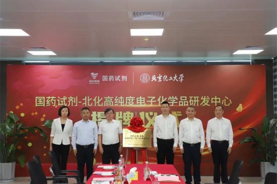 7月14日,国药试剂-北京化工大学“高纯度电子化学品研发中心”揭牌仪式在国药集团化学试剂有限公司全资子公司上海沃凯生物技术有限公司举行。上海市金山区副区长翟金国,北京化工大学党委常委、副校长王峰,金山区科学技术委员会副主任孙朋丽,上海新金山工业投资发展有限公司副总经理徐卫,国药控股工业发展部部长潘波,国药化试党委副书记、总经理王刚,北京化工大学材料科学与工程学院副教授牛津等
