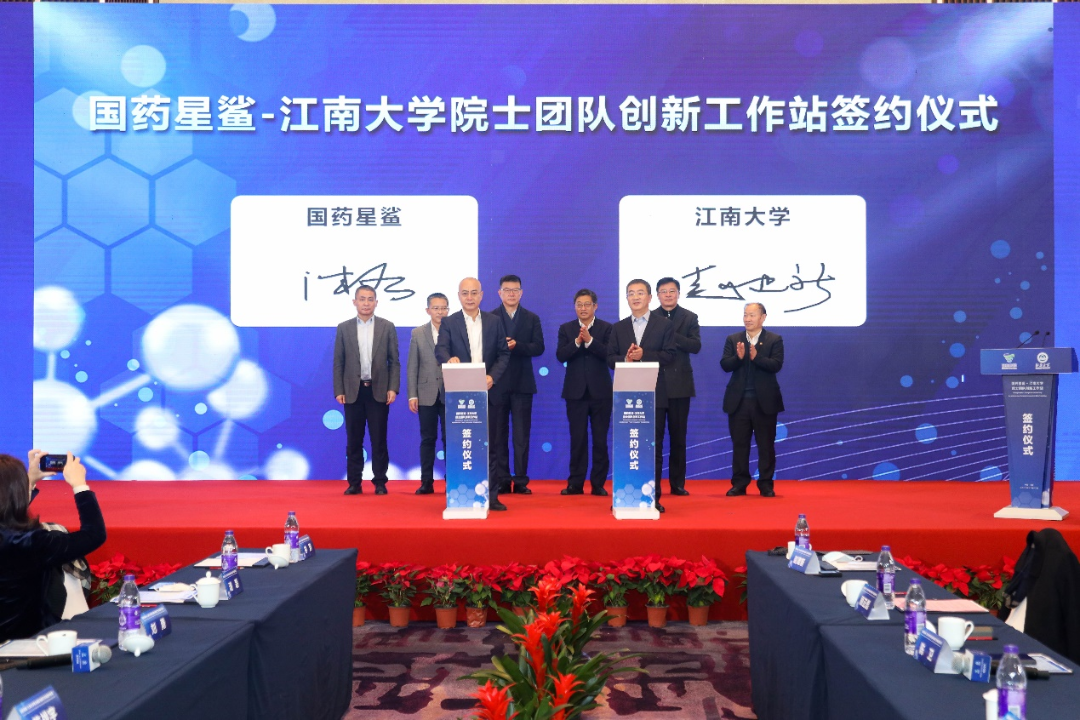 2022年12月12日,“国药星鲨-江南大学院士团队创新工作站”签约揭牌仪式在无锡举行。中国工程院院士、江南大学校长陈卫,党委副书记符惠明,国药集团国药控股总裁、党委副书记刘勇,副总裁陈战宇,工业发展部部长潘波,国药控股星鲨制药(厦门)有限公司总经理潘磊、党委书记林芳、副总经理许福春等参加揭牌仪式。江南大学党委常委、副校长顾正彪主持。
